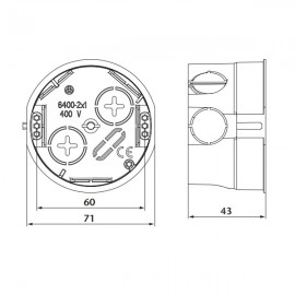 Elektroinstalační krabice pod omítku 6400-221 průměru 71 mm a hloubkou 43 mm je kompletní sada elektroinstalační odbočné krabice dodávané s víčkem i věnečkem (svorkovnicí 4P/3).